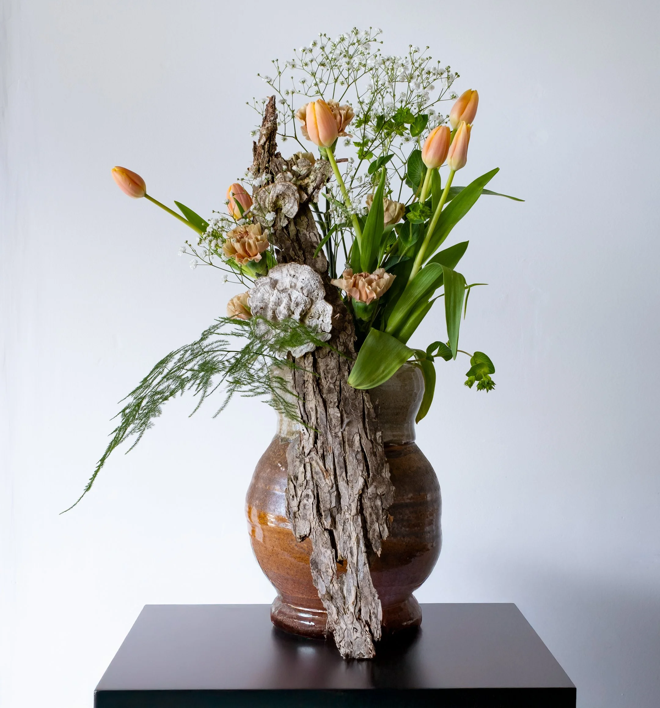Brown vase with live and dried plants.