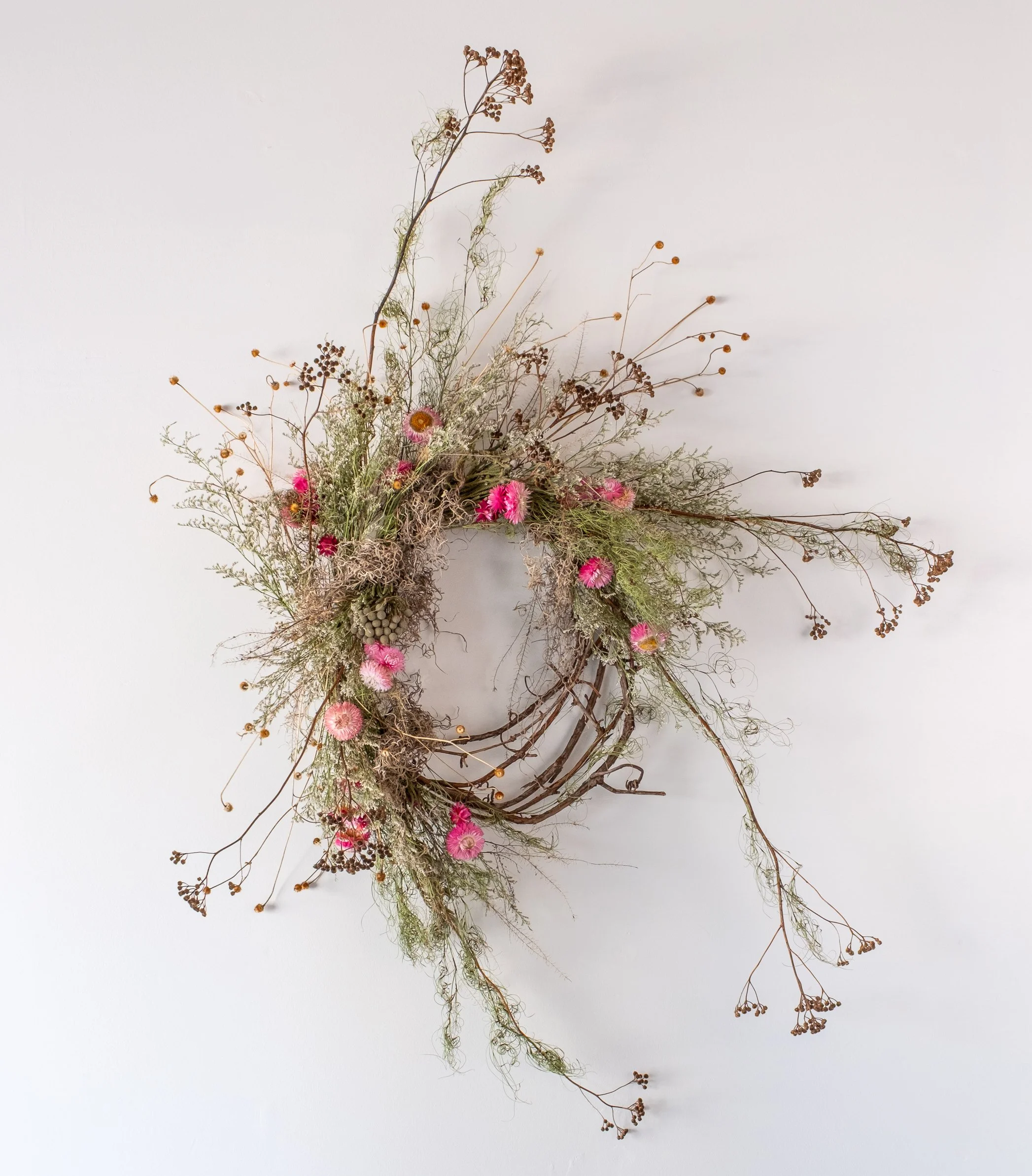 Wreath with dried plants and live flowers